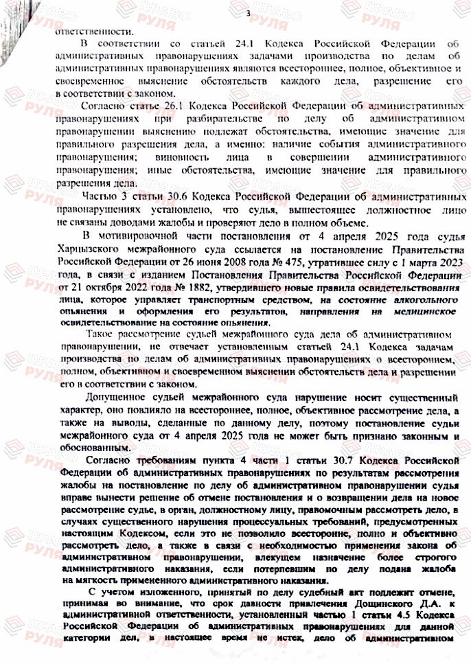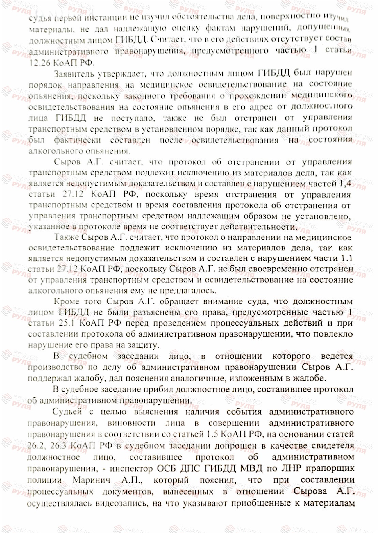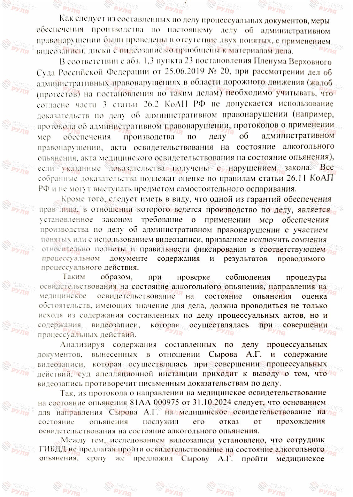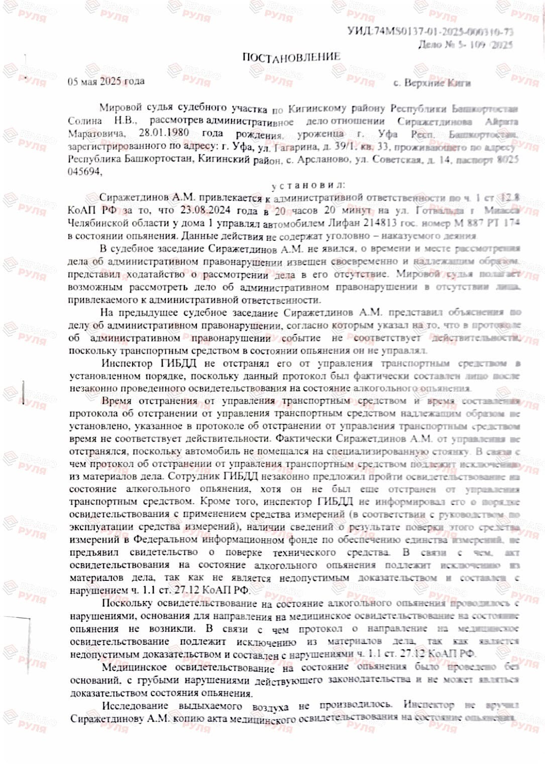 Клиент обратился 16 ноября 2023 года в юридическую компанию Право Руля в день совершения правонарушения. Юристом был подготовлен правовой анализ и найдены грубые нарушения в процедуре. При проведении процедуры отстранения не участвовали понятые и не проводилась видеофиксация. В связи с данным нарушением не был установлен субъект, установление которого необходимо для определения состава. Подробнее: в тексте решения.