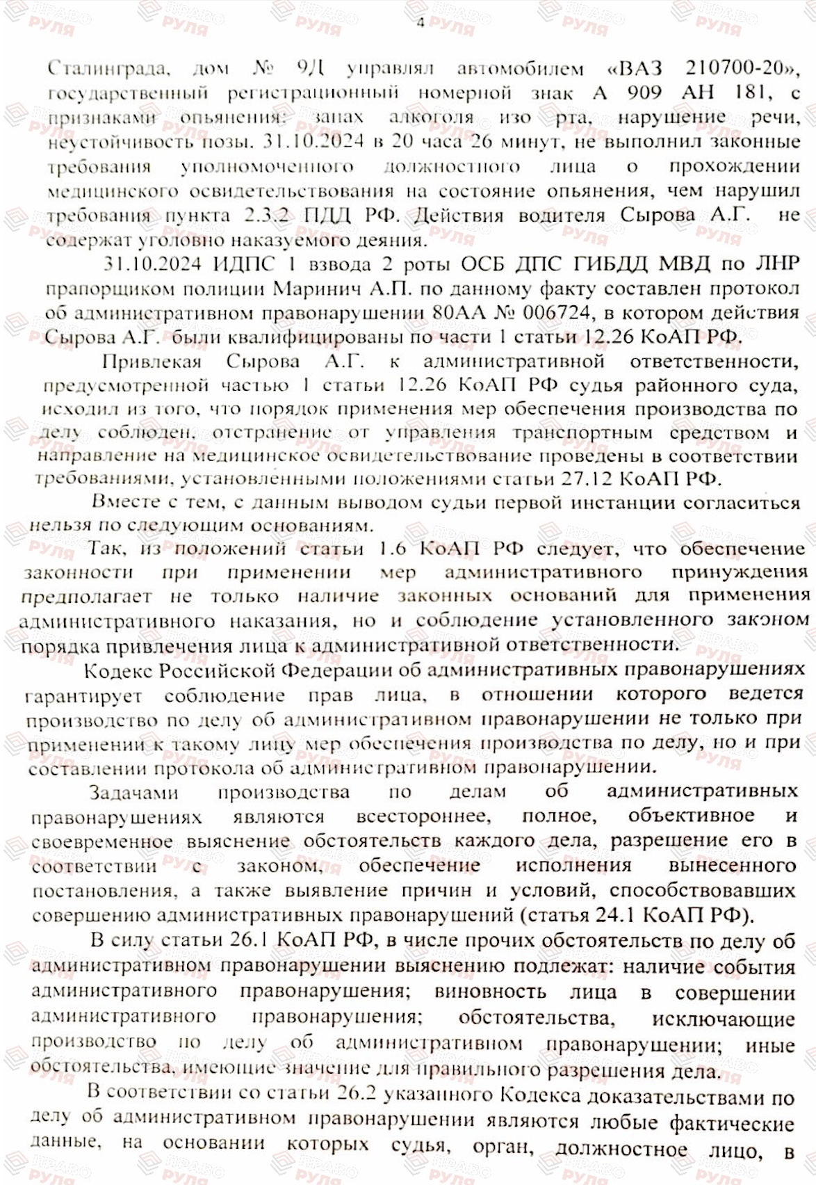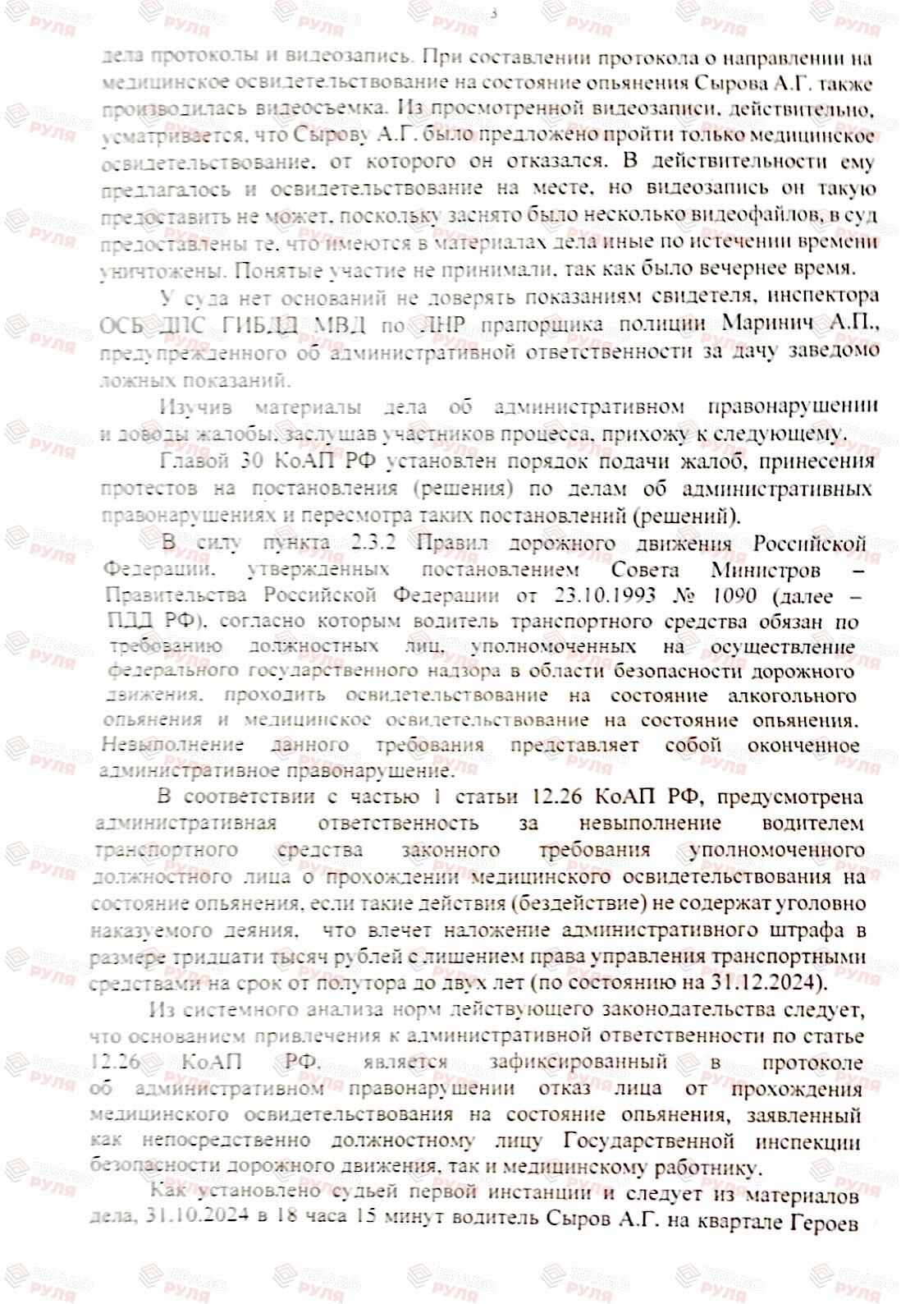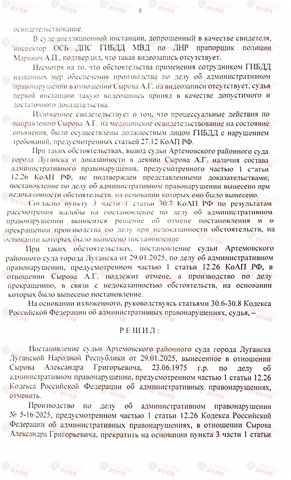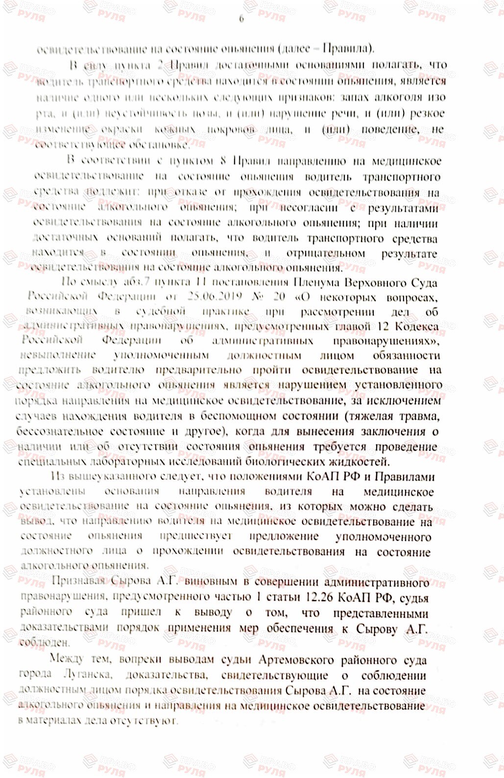 Клиент обратился 16 ноября 2023 года в юридическую компанию Право Руля в день совершения правонарушения. Юристом был подготовлен правовой анализ и найдены грубые нарушения в процедуре. При проведении процедуры отстранения не участвовали понятые и не проводилась видеофиксация. В связи с данным нарушением не был установлен субъект, установление которого необходимо для определения состава. Подробнее: в тексте решения.
