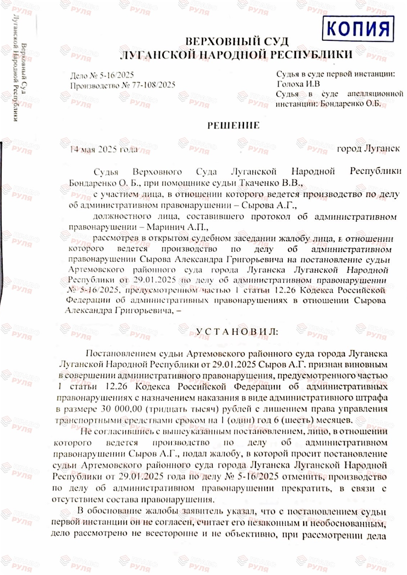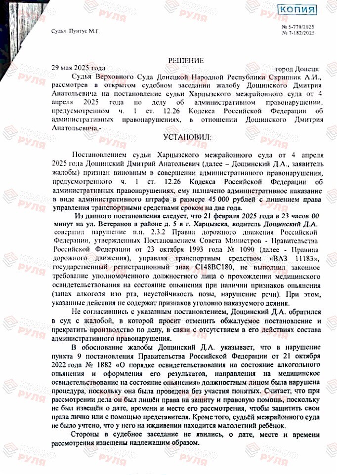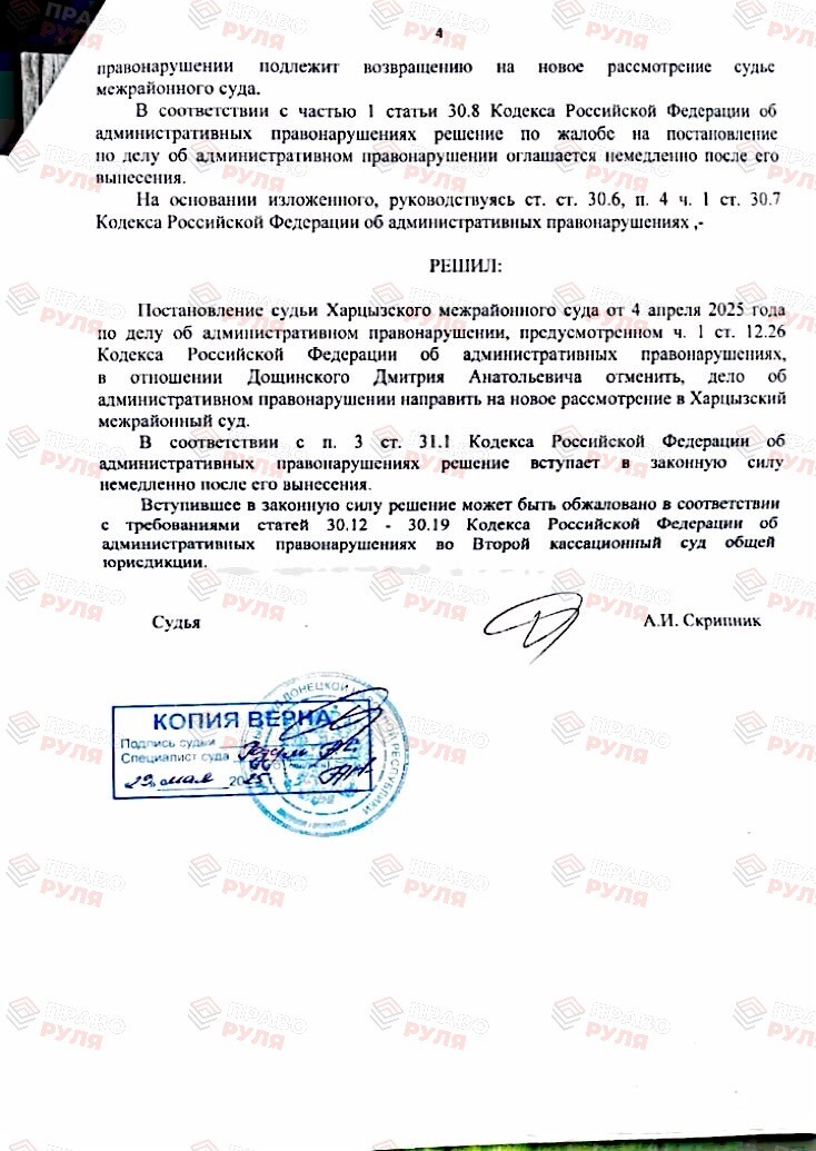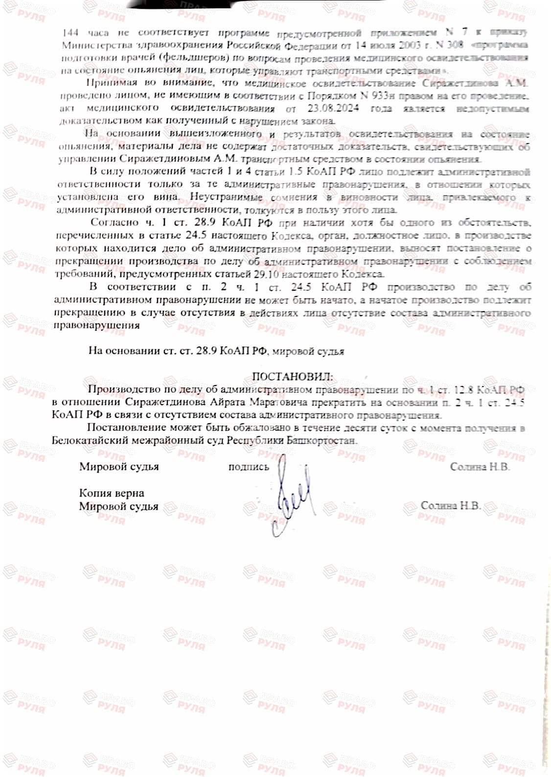 Клиент обратился 9 июля 2023 года в юридическую компанию Право Руля сразу после совершения правонарушения. Юристом оперативно был проведен анализ ситуации и выявлены нарушения инспектора ДПС в процедуре отстранения, а также в порядке прохождения мед. освидетельствования. При таких обстоятельствах привлечения лица к ответственности было незаконным. Суд 1ой инстанции встал на сторону клиента и признал его невиновным. Подробнее: в тексте решения.