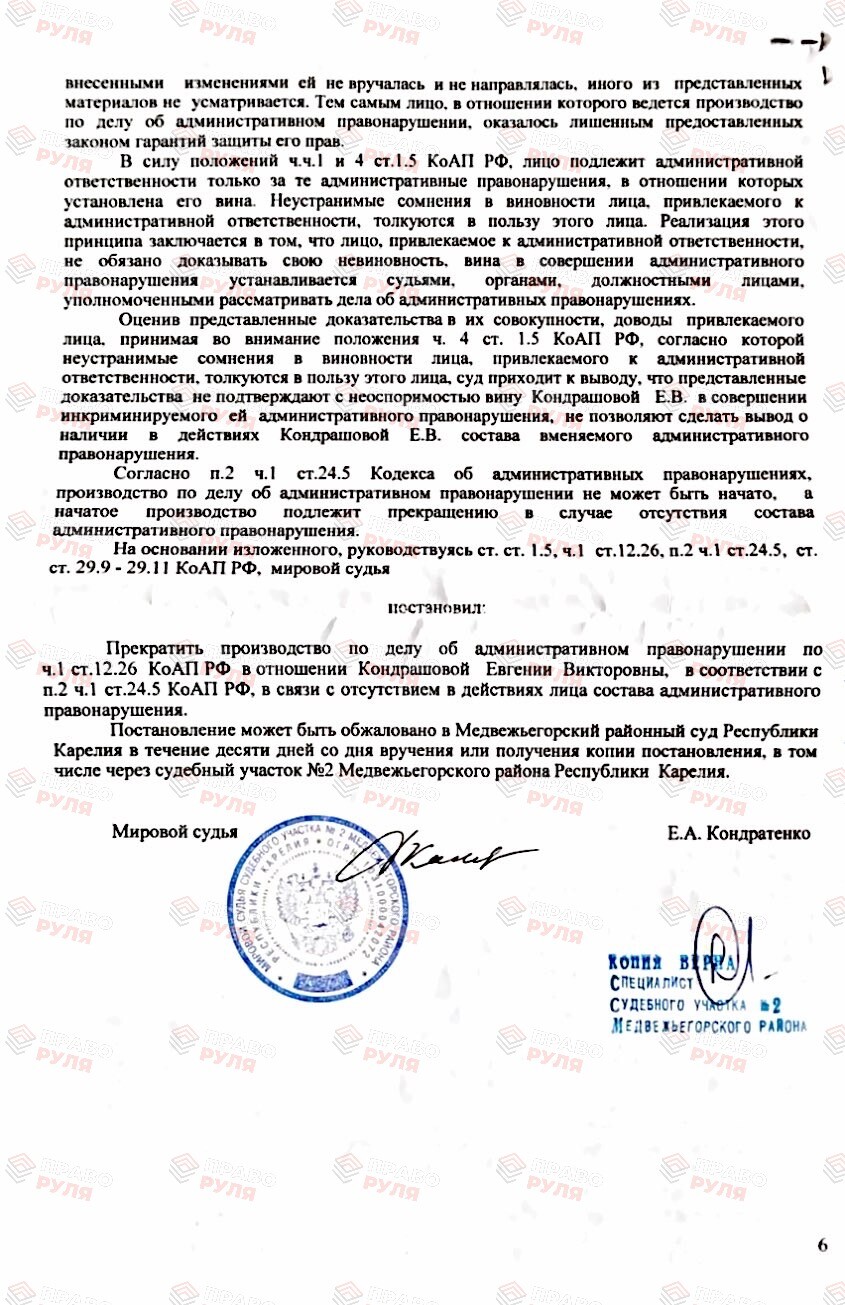 Клиент обратился в нашу компанию в связи с незаконным привлечением его к административной ответственности по ч.1 ст.12.26 КоАП РФ. Юристом был подготовлен правовой анализ и выявлены грубые нарушения при проведении процессуальных действий. В частности, отсутствие состава административного правонарушения. Судом мировой инстанции прекращено производство по делу в связи с отсутствием состава АПН. Подробнее: в тексте постановления.